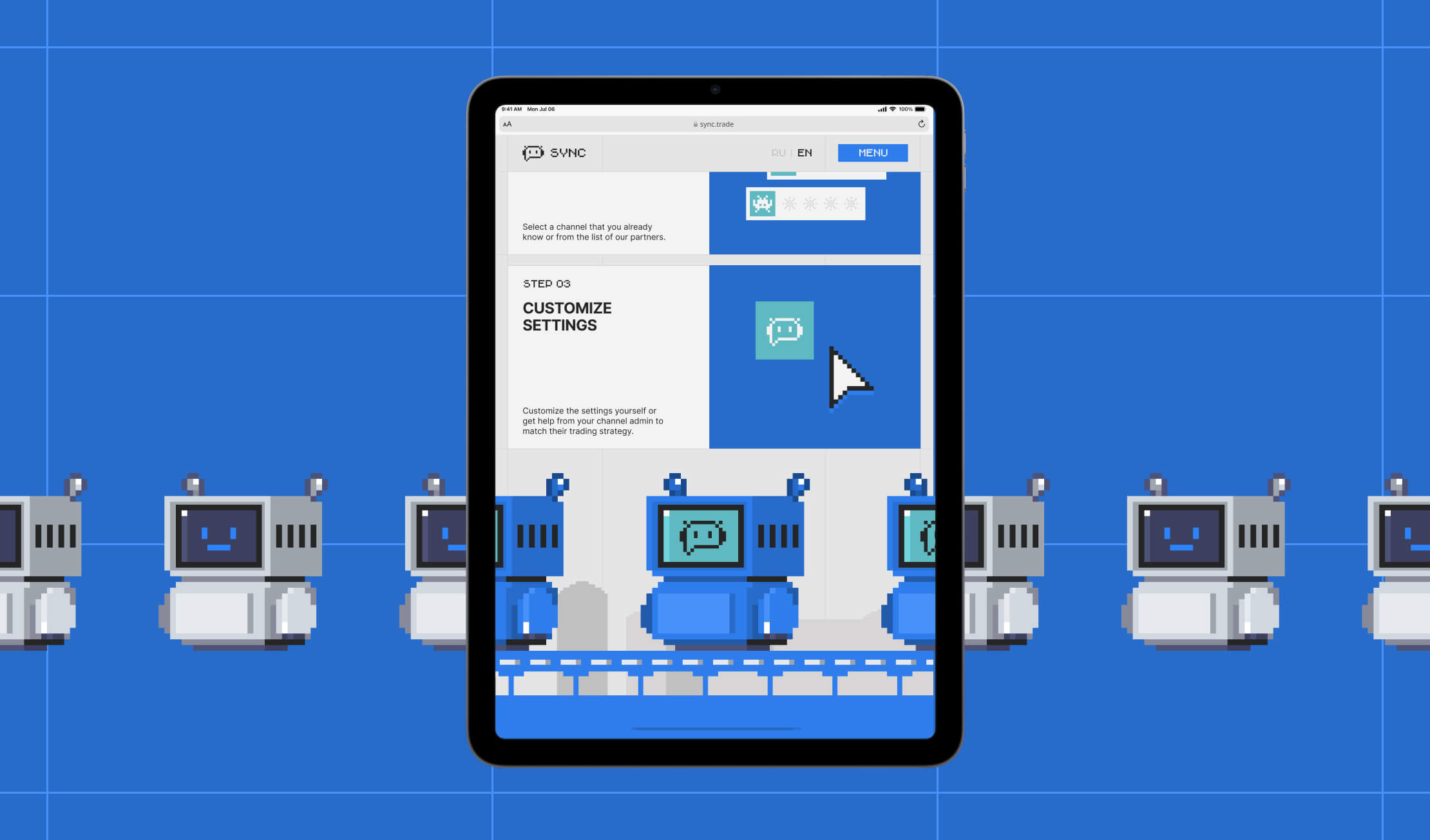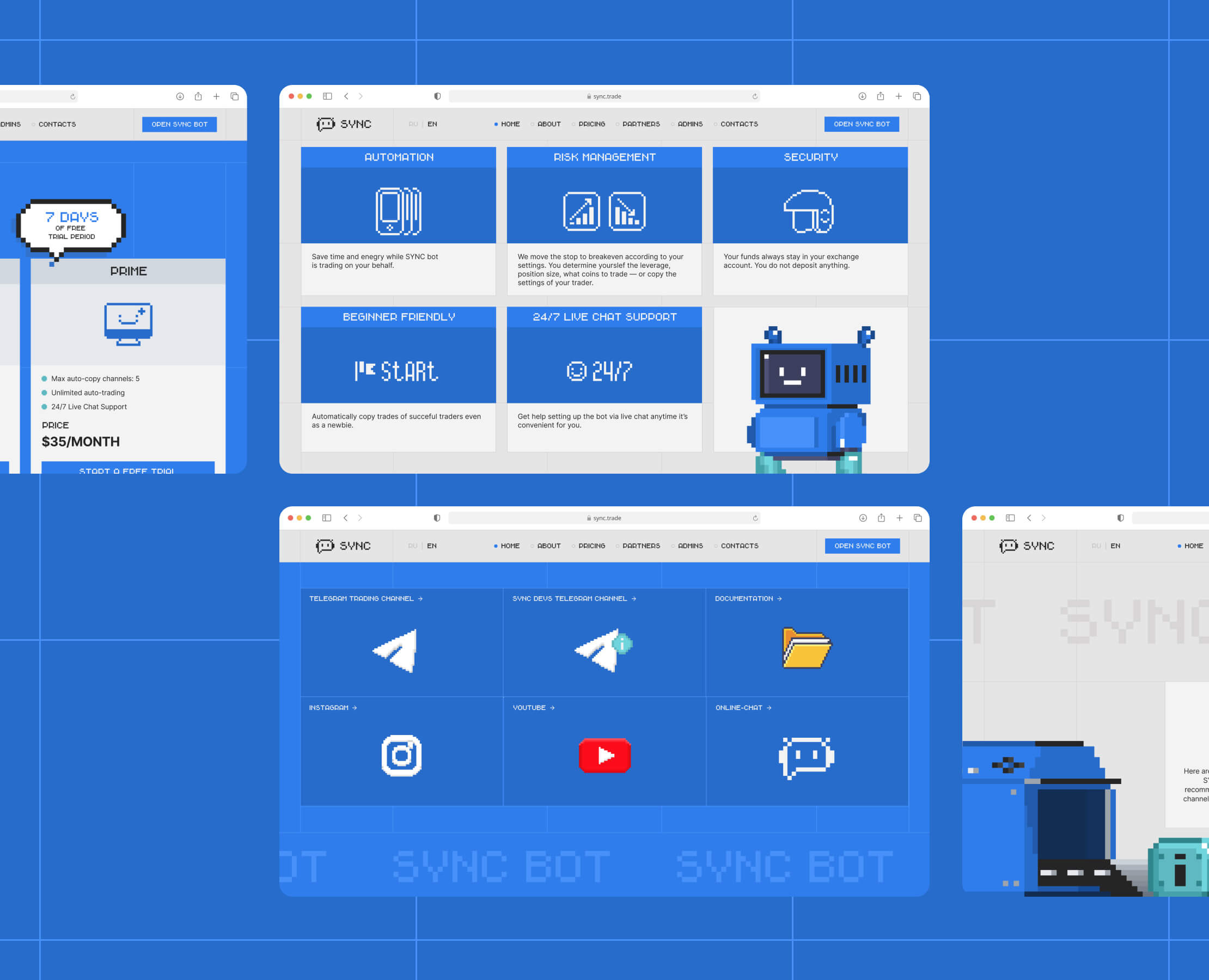 Брендинг и многостраничный сайт на Tilda для авто-трейдинг Телеграм бота на русском и английском языках.